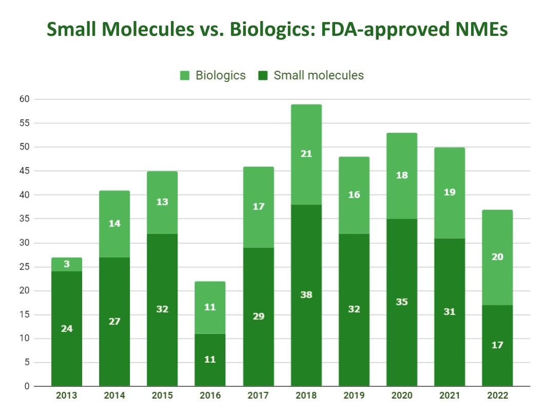 If we talk about the statistics of FDA approvals, I would say biologics are slowly outgrowing SMs in numbers per year, with 2022 being the first year with more approvals in biologics vs. small molecules.