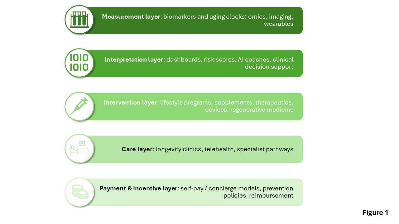 Researchers are increasingly reframing the problem away from purely disease-by-disease fixes and toward the underlying biology of aging that contributes to multiple conditions, such as cancer, cardiovascular, neurodegenerative, and metabolic disease. While the field is only beginning to untangle the complex, and likely multifactorial process of aging, a fledgling longevity industry has emerged around various hypotheses of aging mechanisms. This longevity stack spans different layers from biomarkers and aging clocks that aim to measure biological aging, to therapeutics that target aging-linked mechanisms, as well as care and delivery models (clinics, digital platforms, consulting) that package measurement and interventions into services (Figure 1).