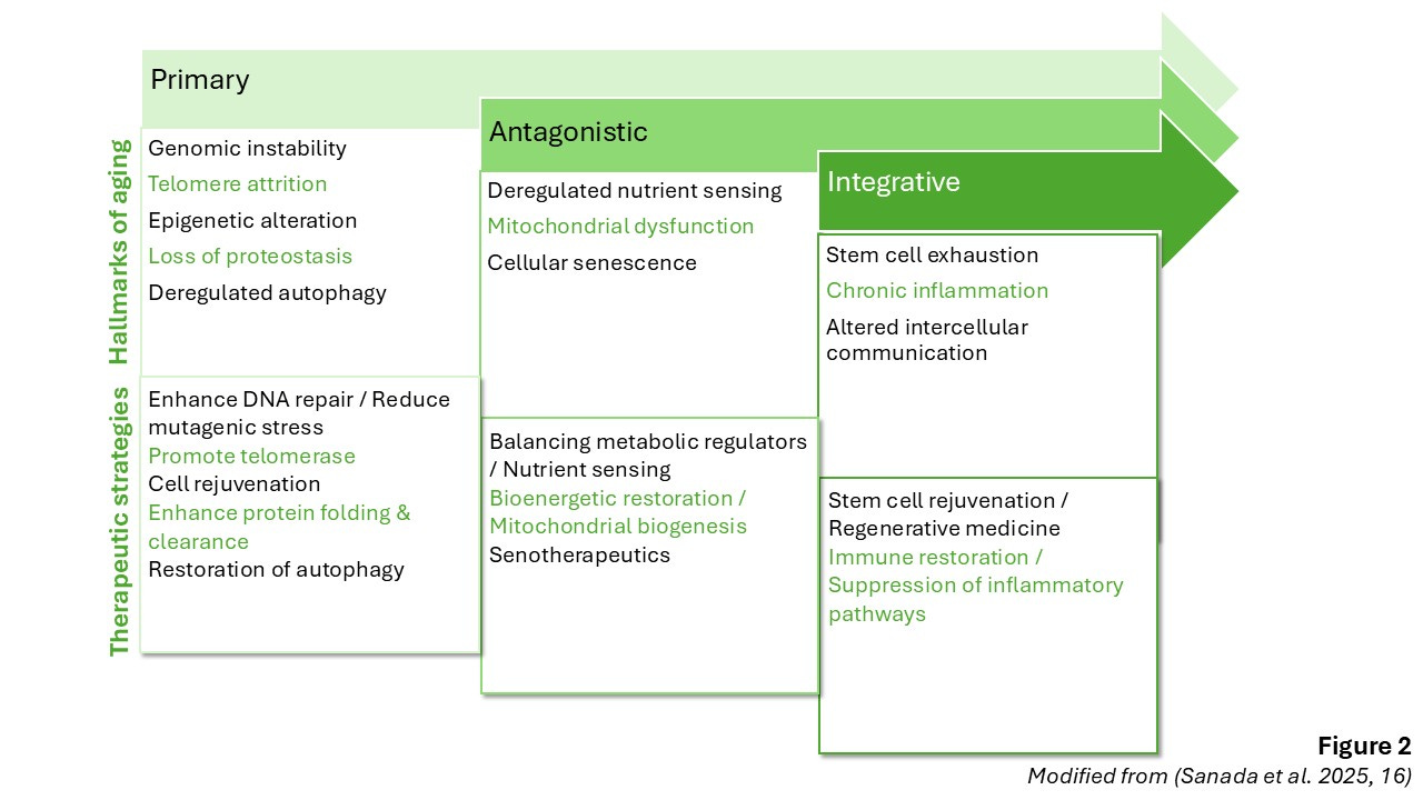 Mitochondrial dysfunction is an aging hallmark and interacts with multiple other hallmarks. Bioenergetics restoration approaches target mitochondrial function and energy production to improve resilience in age-related disorders. Pretzel Therapeutics targets diseases where mitochondrial dysfunction is causal, based on the hypothesis that restoring mitochondrial function and mtDNA maintenance can treat rare mitochondrial diseases and may translate into broader age-associated conditions. In April 2025, the biotech initiated Phase 1 recruitment for PX578, a first-in-class approach targeting mitochondrial DNA polymerase. Similarly, MitoRx Therapeutics’s mitochondrial metabolic modulation platform has the potential to address obesity and other key cardiometabolic diseases. An interesting approach toward improved mitochondrial function is being taken by California-based startup mitrix. The company aims to grow mitochondria in large quantities in a bioreactor, with the goal of targeted, organ-specific replacement of functional mitochondria, with initial exploratory human testing started in 2025, including a 90-year old physics professor emeritus from the University of Washington.
