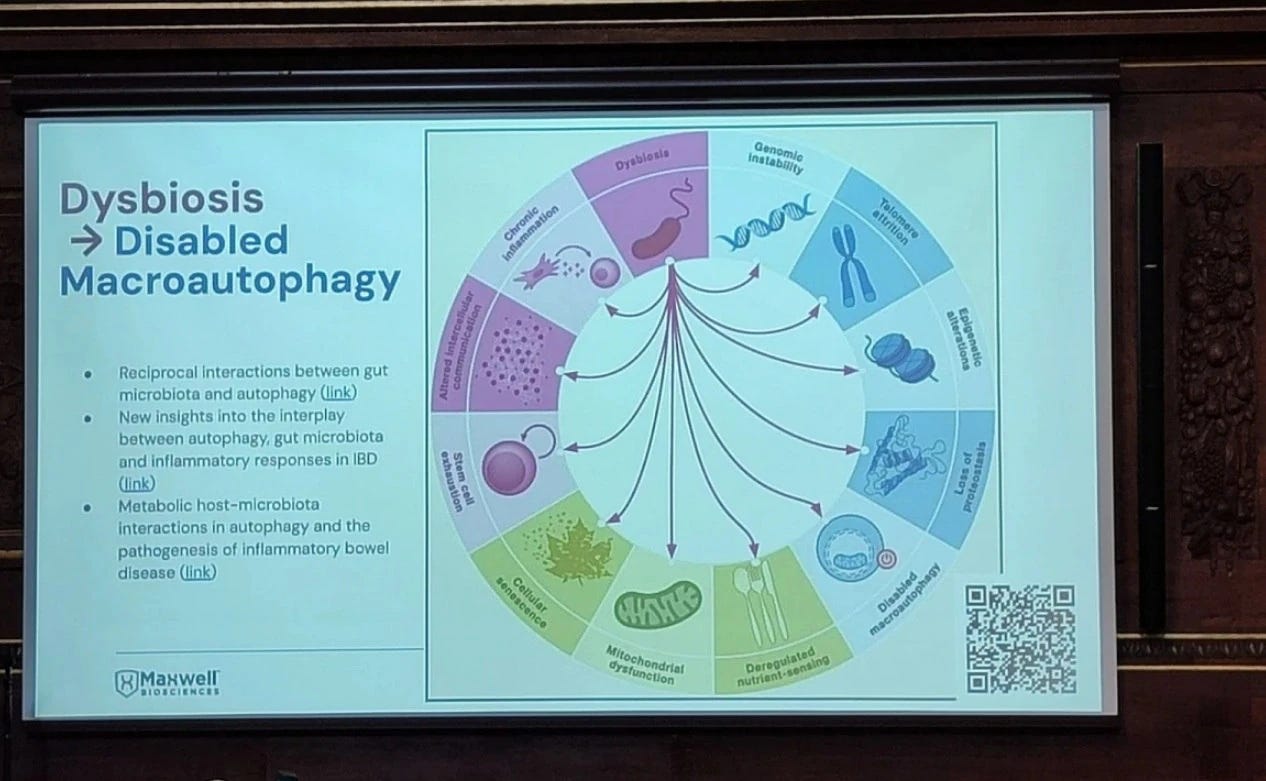 McClure linked dysbiosis directly to all 12 hallmarks of aging, including genomic instability, telomere attrition, epigenetic alterations, mitochondrial dysfunction, cellular senescence, and loss of proteostasis. He cited evidence that dysbiosis impairs stem cell function, deregulates nutrient sensing, and accelerates immune decline (immunosenescence), leading to early onset of frailty, cognitive decline, and chronic disease.