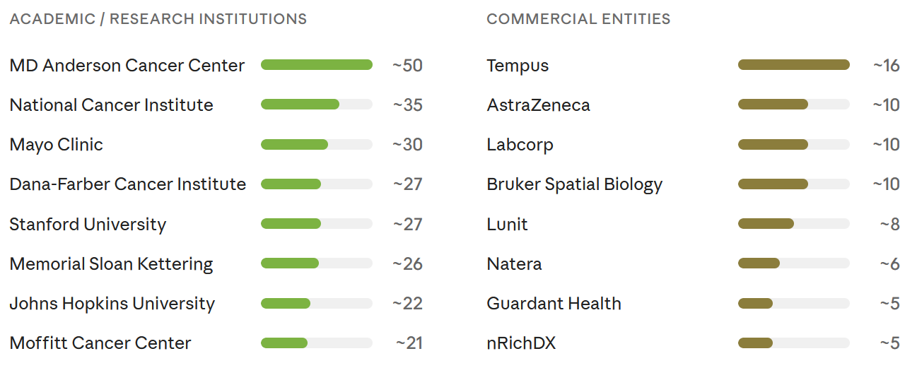 The leaderboard of AI-related abstract affiliations at AACR 2026, split by academic institutions and commercial entities: