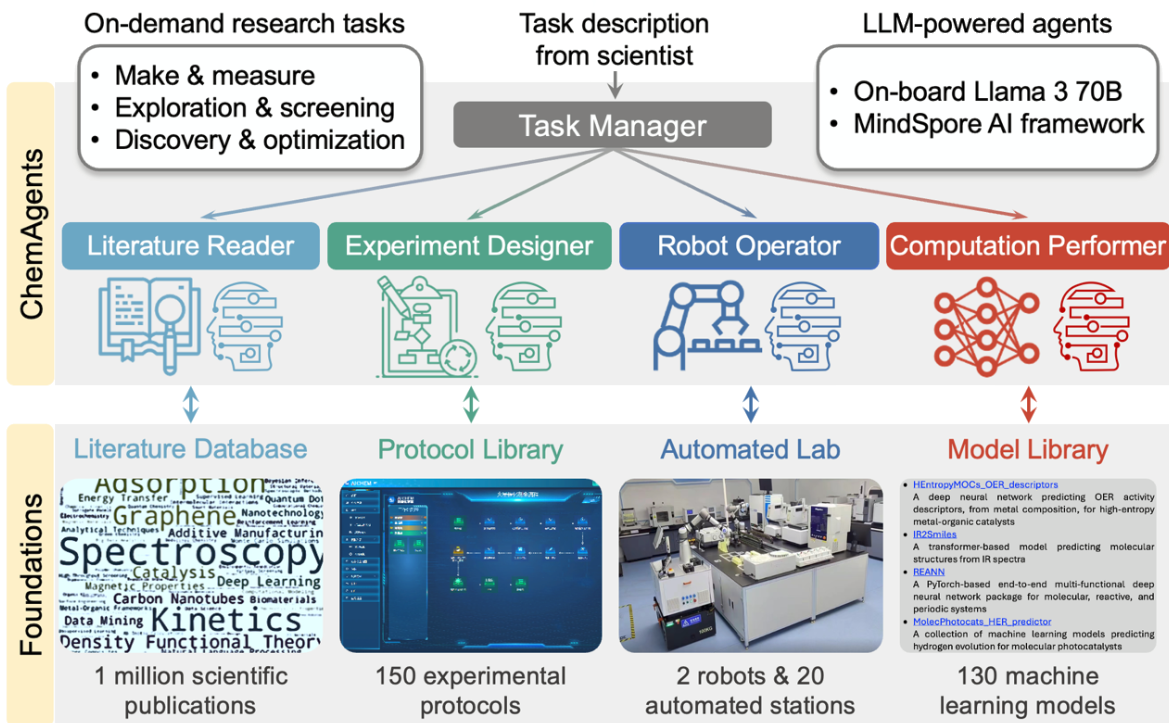 According to the study, ChemAgents is built around Llama-3-70B, an LLM integrated into a hierarchical multi-agent system. It consists of five core agents: a Task Manager that oversees operations and four specialized agents—Literature Reader, Experiment Designer, Computation Performer, and Robot Operator—each tasked with different stages of the research process. The system employs four key resources: a scientific literature database, a protocol library for experimental design, a machine learning (ML) model library, and an automated lab with robotic infrastructure.