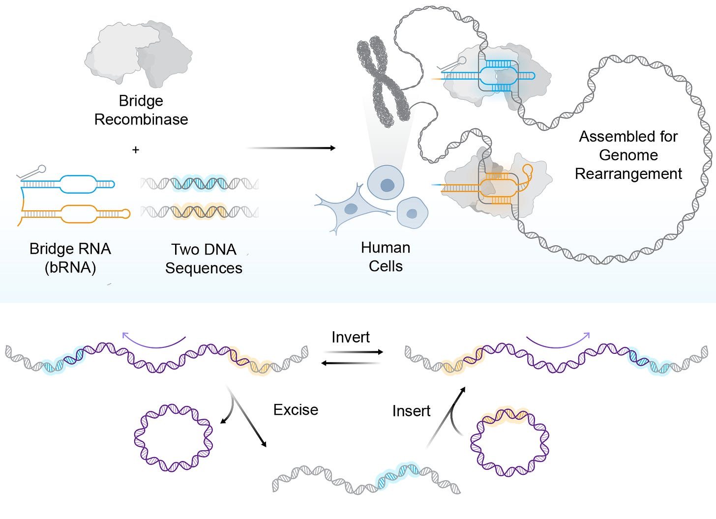 The system was first described in Arc’s May 2025 preprint, where bridge recombinases pair a recombinase enzyme with a structured “bridge RNA” that recognizes two DNA sites at once, bringing distant loci together so the enzyme can cut-and-paste, excise, or flip sequence segments in a single programmed step. The team previously showed bridge recombination in bacteria; today’s paper extends it to human cells.