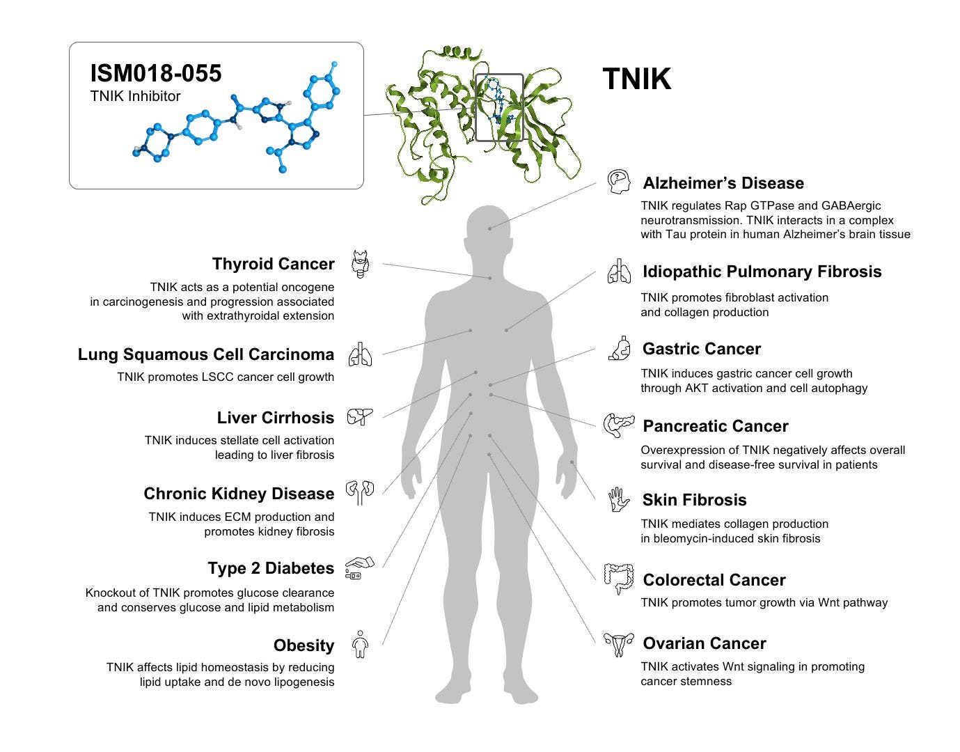 055, or ISM018-055, is a small molecule inhibitor of TNIK that Insilico Medicine designed using its generative AI platform Pharma.AI and managed to advance into clinical trials within just a couple of years since the start of the project.