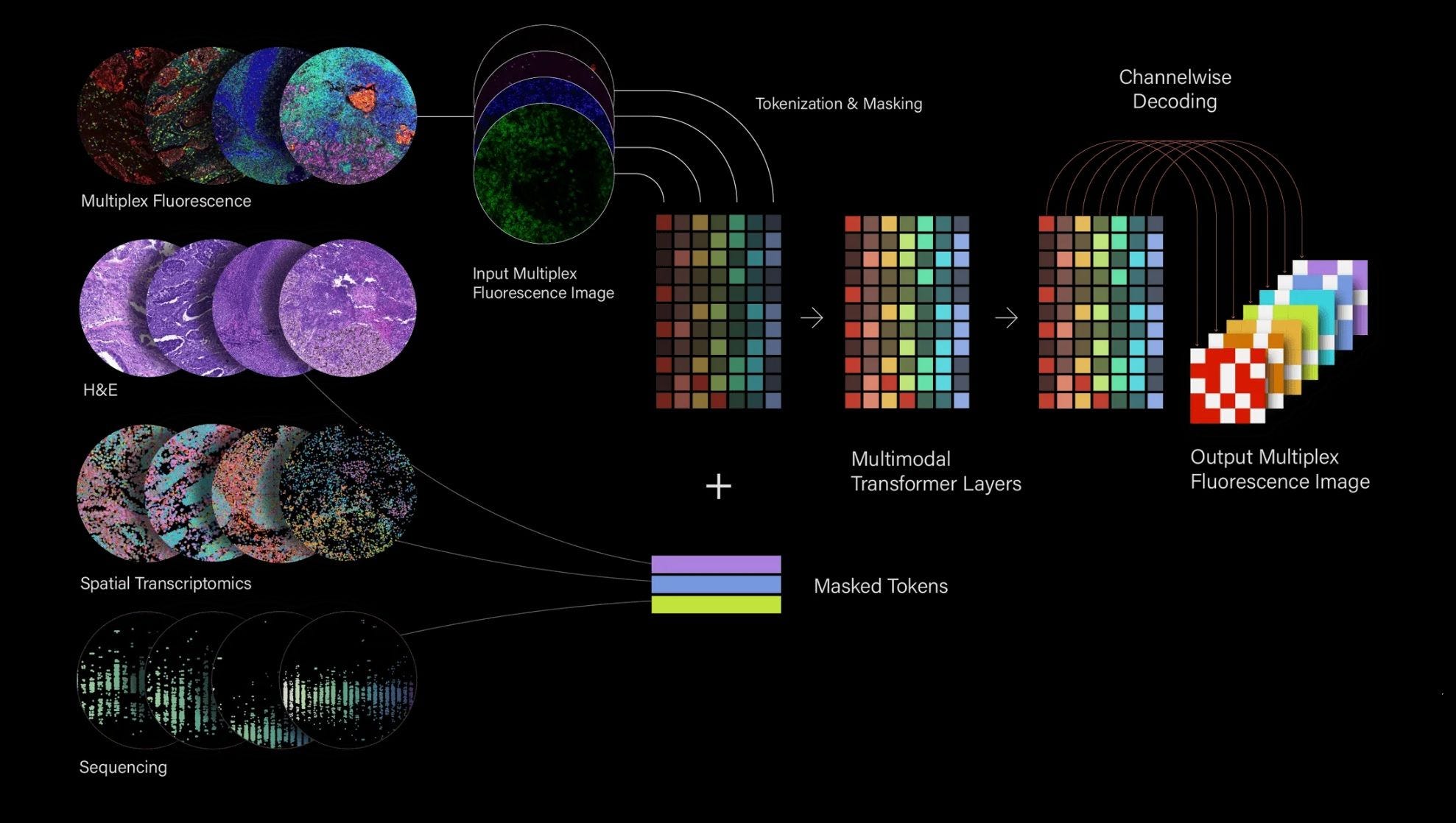 Converts multiplex fluorescence images into discrete color channels, then into "patchified" tokens.