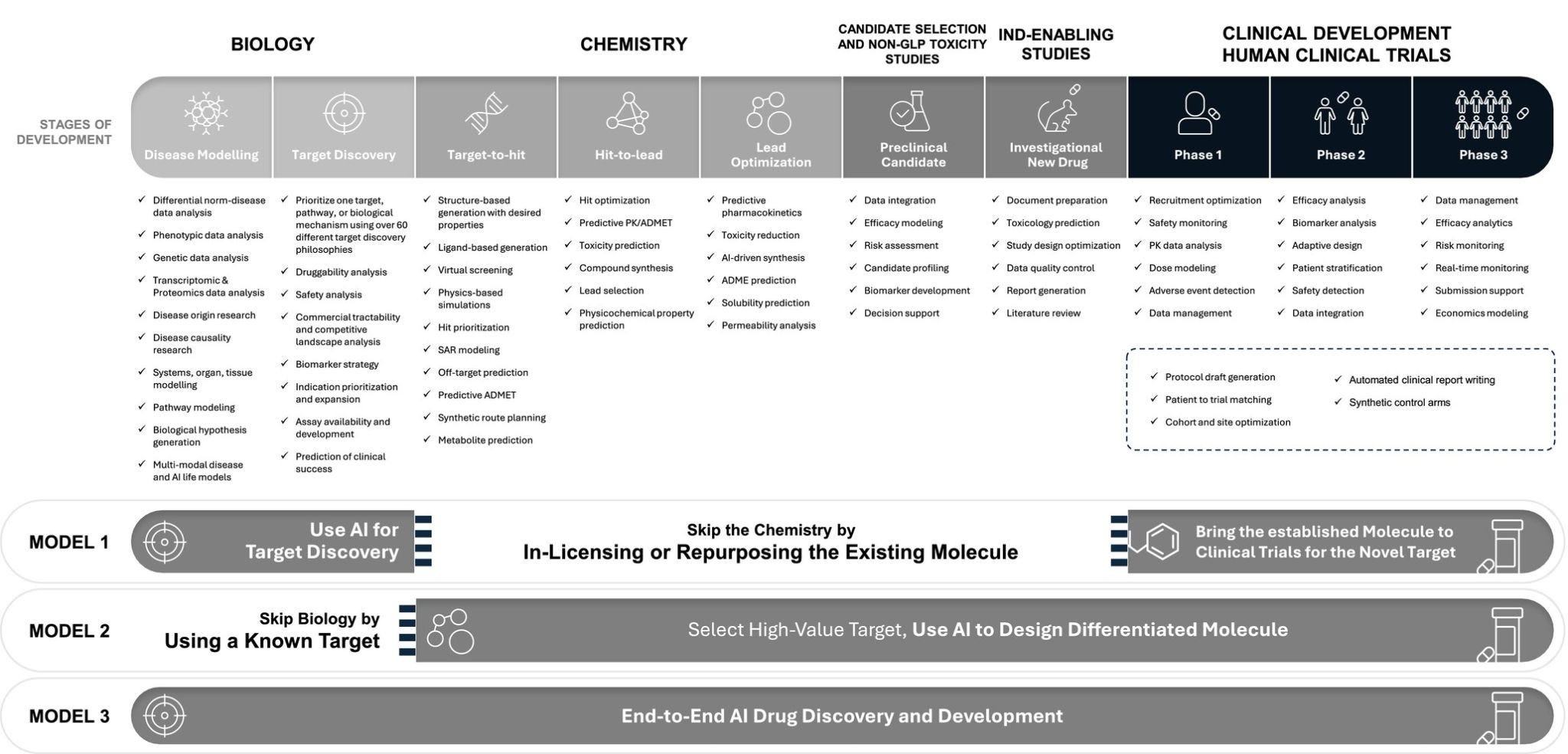 First, repurposing known drugs or generics, where AI is used to identify disease targets and repurpose molecules for Phase II trials, but the approach often struggles with demonstrating efficacy.